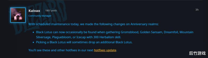 周例维护之后,暴雪作出周年服黑莲花的重要调整,加入伴生,并增加单次采集数量。国服应该在周四维护之后实装。